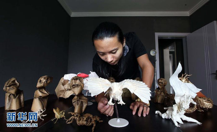 Ο Τσιν Κουν δείχνει τα οριγκάμι που έχει φτιάξει, 6 Σεπτεμβρίου 2015. [Φωτογραφία / Xinhua]