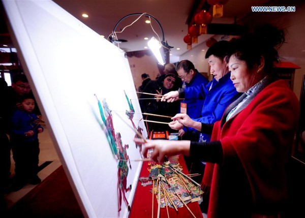 Η λαϊκή καλλιτέχνης Λιν Σιμίν (πρώτη από δεξιά) ενώ παίζει θέατρο σκιών του Γκαϊτζόου κατά τη διάρκεια μιας έκθεσης Άυλης Πολιτιστικής Κληρονομιάς στο Μεγάλο Θέατρο της Λιαονίνγκ στη Σενγιάνγκ, επαρχία Λιαονίνγκ της βορειοανατολικής Κίνας, στις 18 Φεβρουαρίου το 2016. Περίπου 100 διάδοχοι Άυλης Πολιτιστικής Κληρονομιάς παρουσίασαν τα ταλέντα και τις δεξιότητές τους, την Πέμπτη. (Φωτογραφία: Xinhua)