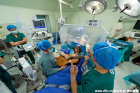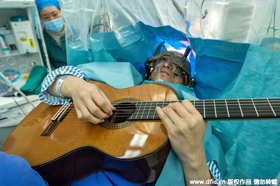 Φωτογραφία ενός μουσικού που παίζει κιθάρα κατά την διάρκεια χειρουργικής επέμβασης κρανιακού νεύρου σε ένα νοσοκομείο της πόλης Σεντζέν, επαρχία Γκουανγκντόνγκ της νότιας Κίνας στις 25 Ιαν 2016. Ο μουσικός υπέφερε από εστιακή δυστονία, μια ασθένεια που τελικά οδηγεί σε παράλυση των μυών που χρησιμοποιεί για να παίξει το μουσικό όργανο. Η επέμβαση απαίτησε από αυτόν να παίξει κιθάρα κατά την διάρκεια της επέμβασης για να επιτρέψει στους γιατρούς να ανιχνεύσουν και να καταγράψουν σήματα που αποστέλλονται από τον εγκέφαλό του. Μετά από 3 ώρες, η επέμβαση ολοκληρώθηκε με απόλυτη επιτυχία και το δεξί χέρι του μουσικού ήταν και πάλι κανονικό. [Φωτογραφία: Imagine China]