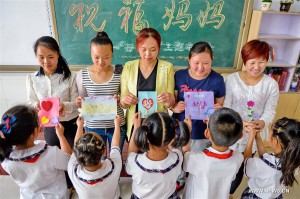 Οι μαθητές ενώ δίνουν ευχετήριες κάρτες στις μητέρες τους κατά τη διάρκεια μιας εκπαιδευτικής δραστηριότητας για τον εορτασμό της Ημέρας της Μητέρας στο Δημοτικό Σχολείο Λονγκτσιουάν στην Σινγκτάι, επαρχία Χεμπέι της βόρειας Κίνας, στις 8 Μαΐου το 2016. (φωτογραφία: Xinhua)