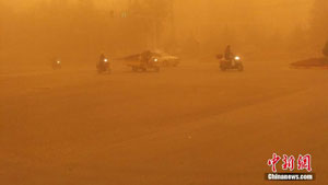 Η φωτογραφία δείχνει ανθρώπους να οδηγούν σε μια μεγάλη αμμοθύελλα που σάρωσε την νότια Σιντζιάνγκ, στις 12 Μαΐου 2016. Περιοχές όπως Αξού, Κασγκάρ, Μπατζόου και Χοτάν επίσης επηρεάστηκαν από την αμμοθύελλα, με την ορατότητα να μην φτάνει τα 500 μέτρα σε ορισμένες περιοχές. Οι τοπικές μετεωρολογικές υπηρεσίες λένε ότι η αμμοθύελλα αναμένεται να διαρκέσει μέχρι την Πέμπτη.