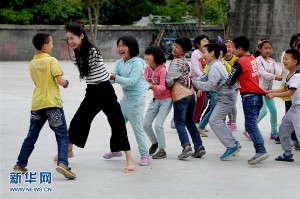 Η Γιανγκ ενώ παίζει με τους μαθητές στο παλιό της σχολείο. (Φωτογραφία: Xinhua)