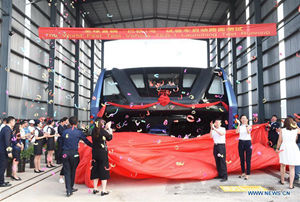 Το υπερυψωμένο λεωφορείο TEB-1 είναι υπό δοκιμή στον δρόμο στην Τσινχουανγκντάο, επαρχία Χεμπέι της βόρειας Κίνας, 2 Αυγούστου 2016.